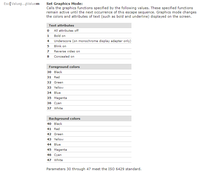 控制台能显示 RGB888 这样丰富的颜色,也是 ANSI Escape 标准不断扩展,比如参照下面这张表,在控制台打印 \033[44m 就可以把背景色设置为蓝色 (Esc = \033)。
